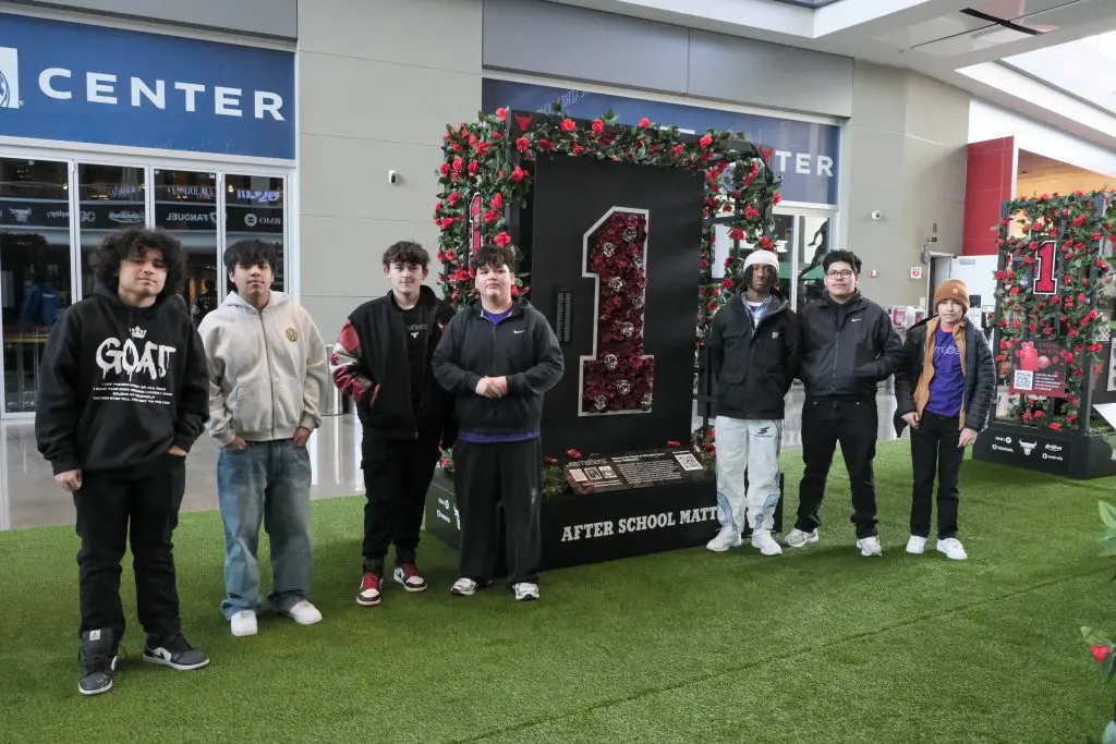 Advanced Visual Arts and Lutz Center Welding teens also showcased Derrick Rose–inspired artwork at the United Center Atrium, including paintings and metal roses arranged into a giant number one to commemorate his jersey number. Fans stopped by to take photos and celebrate the teen-created pieces throughout the day and into the evening.