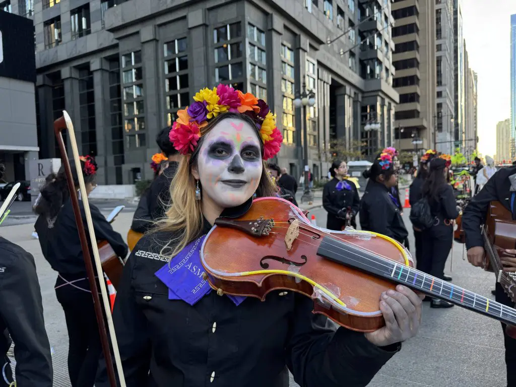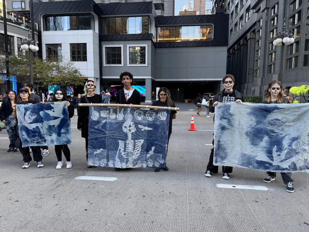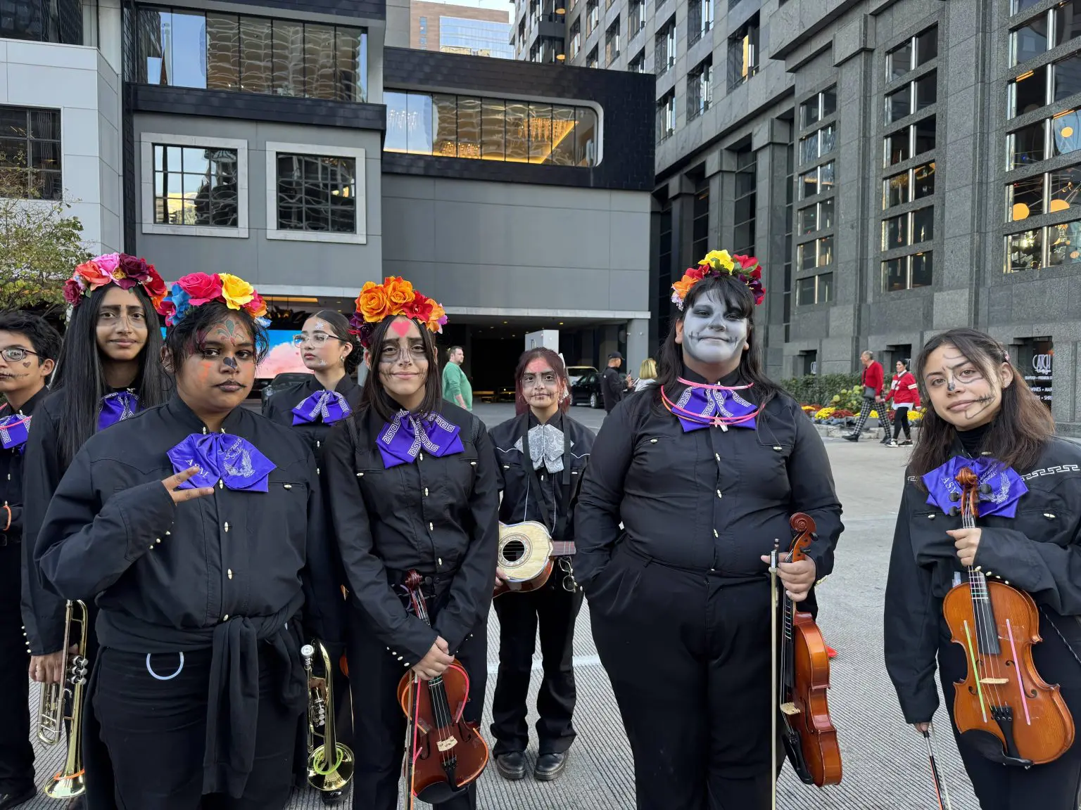 Teens in our Mariachi Ensemble at Juarez High School and the Experimental Photography in the Dark Room program at Gallery 37 proudly represented After School Matters in the 10th Annual Arts in the Dark Parade along historic State Street. The event celebrated Halloween, bringing together artists, performers, and community organizations from across the city, entertaining 50,000 parade-goers with an unforgettable evening of creativity and fun. Our teens had an incredible time performing classic mariachi songs and capturing stunning photos of the festivities, showcasing their talent and passion for the arts.