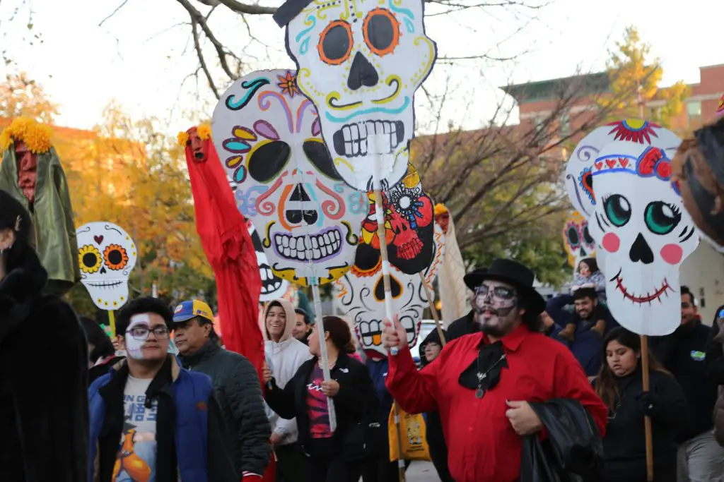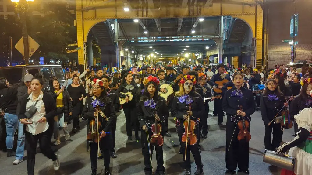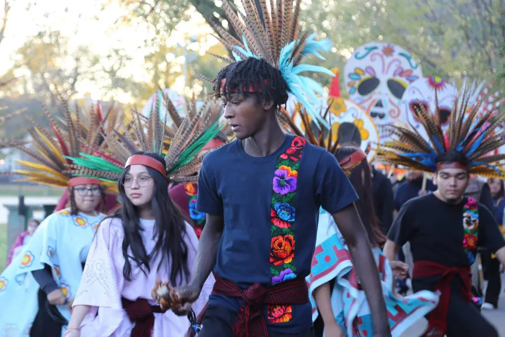 Our young Aztec Dancers performed at the 45th Annual Día de los Muertos de la Raza celebration at Dvorak Park in Pilsen. The parade brought together people from all over Chicago and the suburbs to honor and remember loved ones and pets who have passed. Guests enjoyed hot chocolate and conchas, a traditional Mexican sweet bread, along with vibrant dances, beautiful puppets, and ofrendas dedicated to those who are no longer with us.