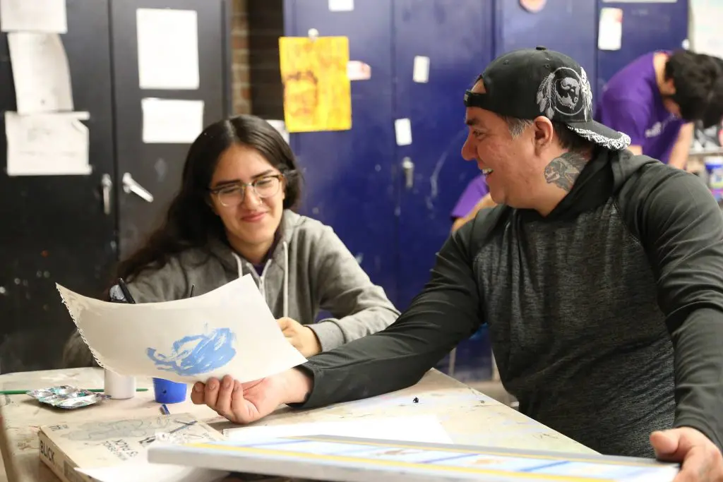 Chicago muralist and longtime After School Matters instructor Erick “Roho” Garcia has been educating young artists for more than a decade—using murals to empower teens to find their voices and paint their stories. Rooted in Hip Hop culture, his Latin roots, and graffiti art, Roho has led ASM teens in creating more than ten large-scale murals across the city in partnership with organizations like Lollapalooza, Hire360, and NASCAR—including his recent mural with 13 teens at Gately Park that celebrates the building as a safe, supportive space where teens can learn, grow, and fully be themselves. Now proudly displayed above the staircase in the Center Space for teens, his vibrant works reflect the energy and creativity of Chicago’s youth. For many teens, Roho’s programs are their first experience with a paintbrush—and by the end, they’ve gained not only new artistic skills but also confidence and pride that extend far beyond the canvas.
