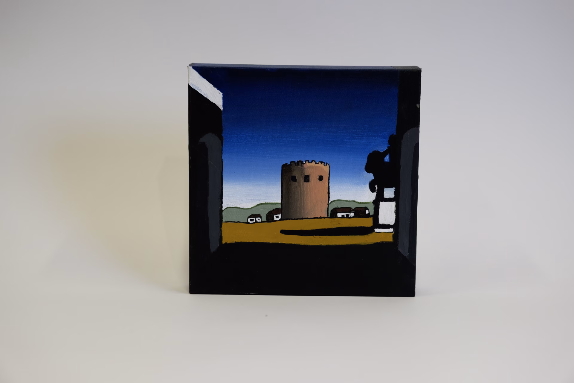This painting on canvas features a lone tower from a fortified castle, framed through the perspective of looking out a window.