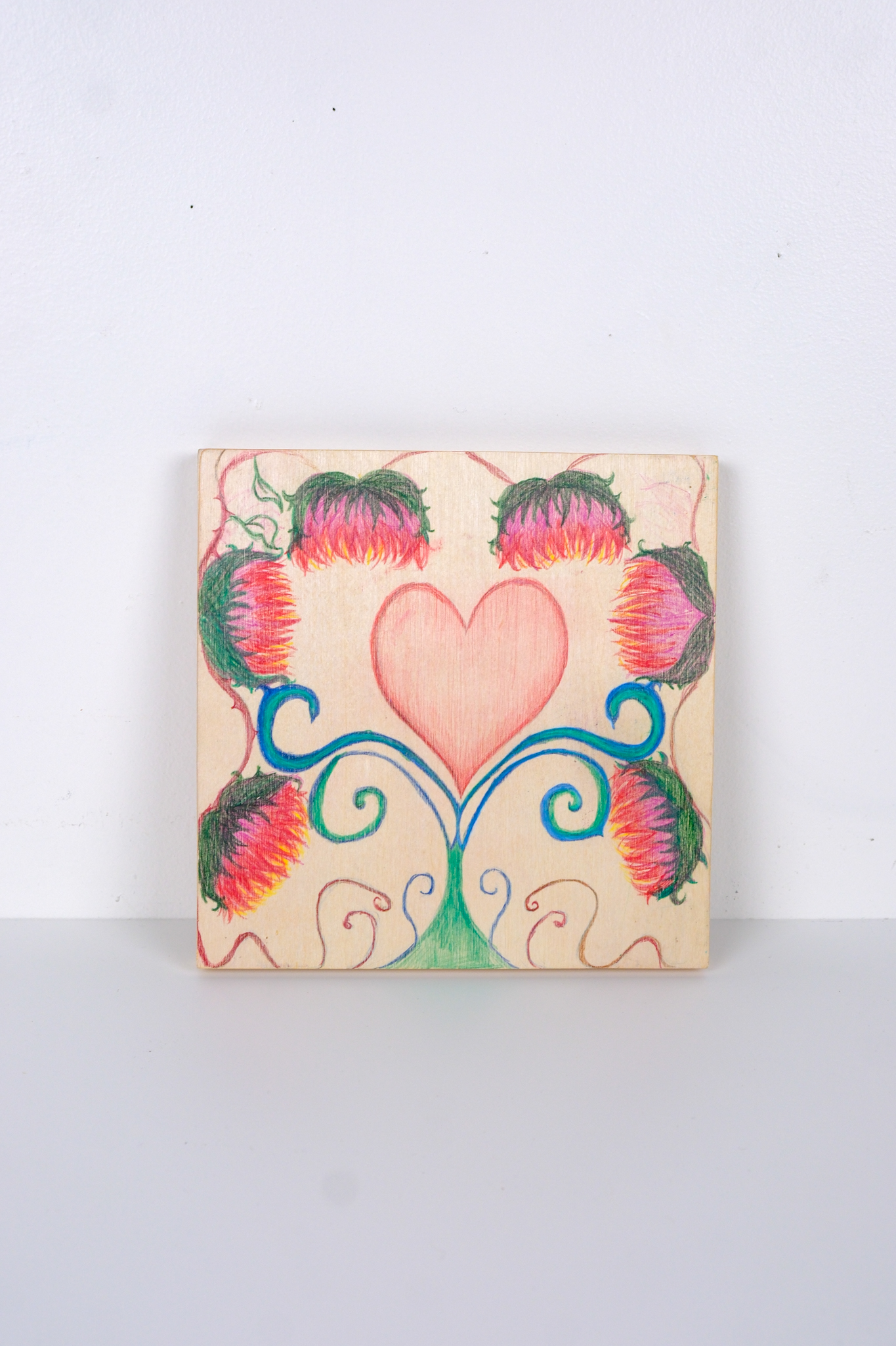 Colored pencil drawing on a wooden panel of an abstract floral design with a heart shaped flower in the center.
