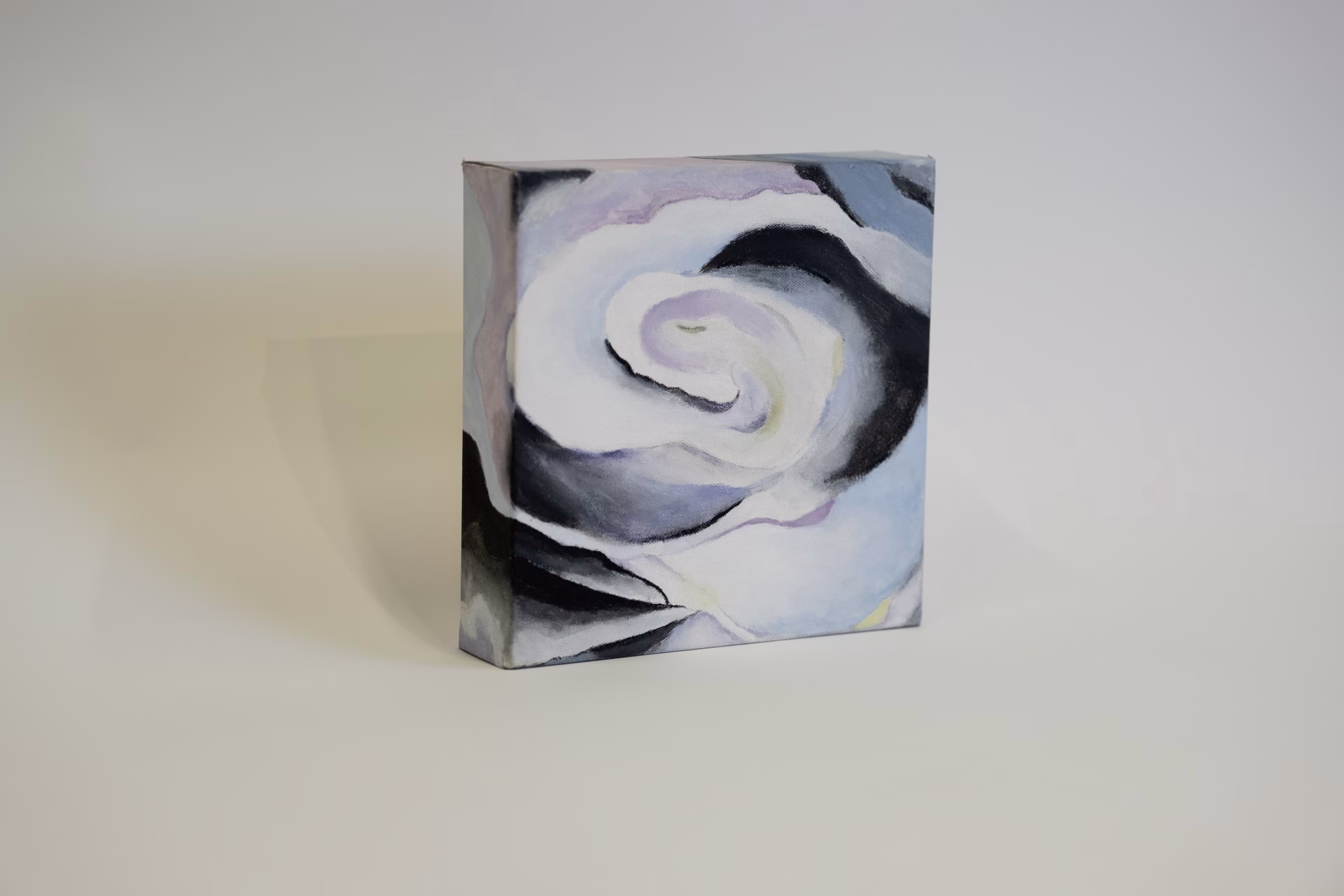 This painting features a closeup of a light, pastel-colored flower bloom in reference to the style of painter Georgia O’Keefe.