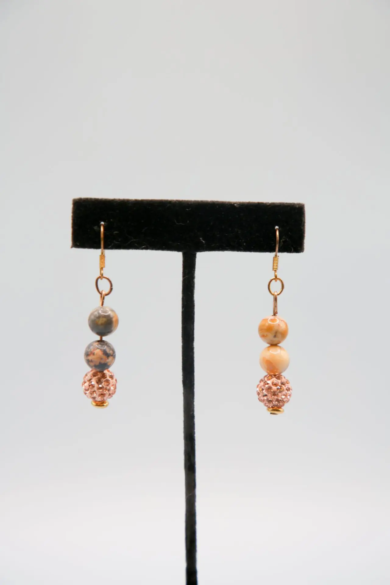 Two jasper beads with gold and pink rhinestone bead with gold hardware