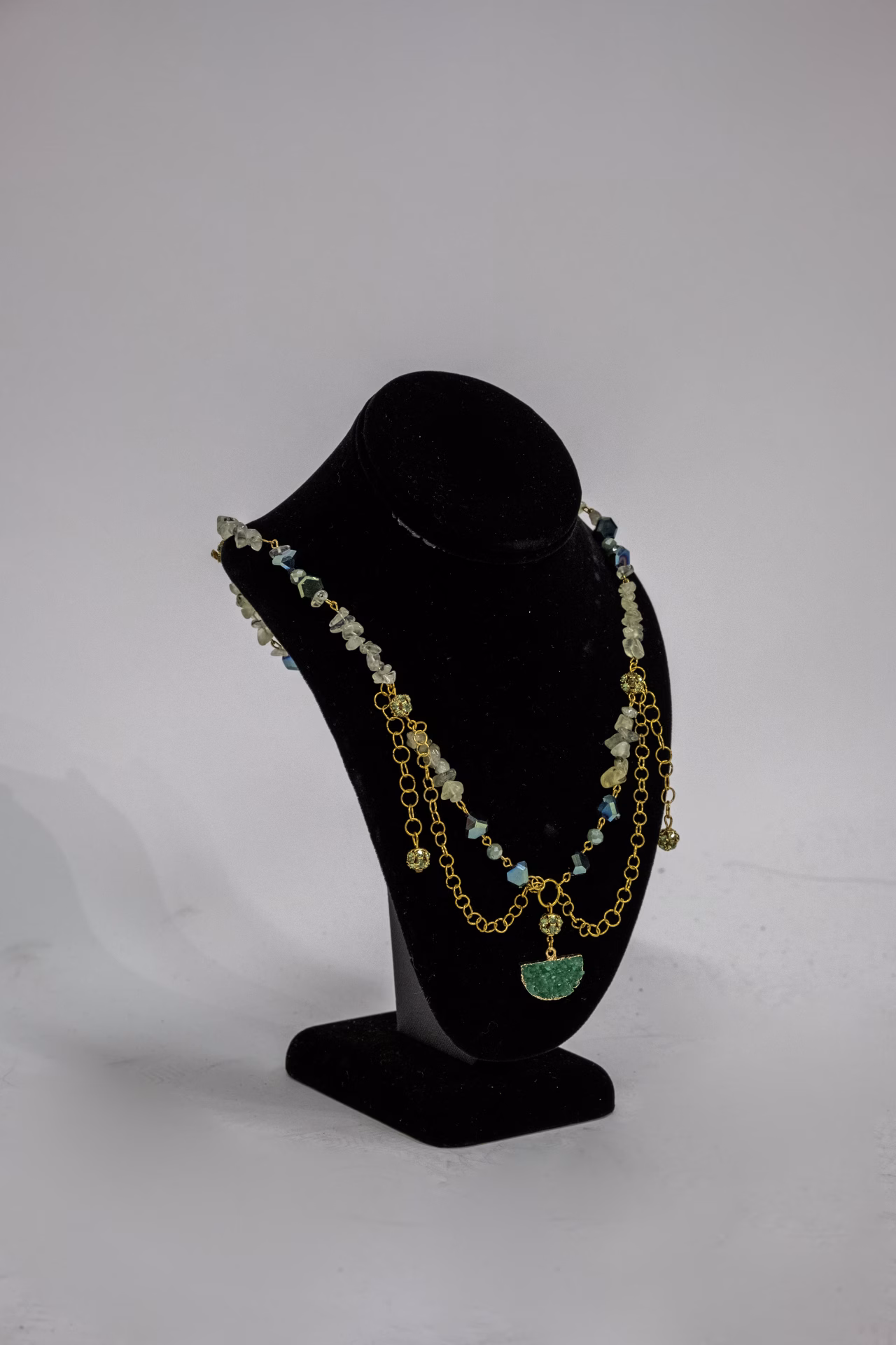 Green Beads with Gold Hardware and a Green Stone – Necklace and Earrings