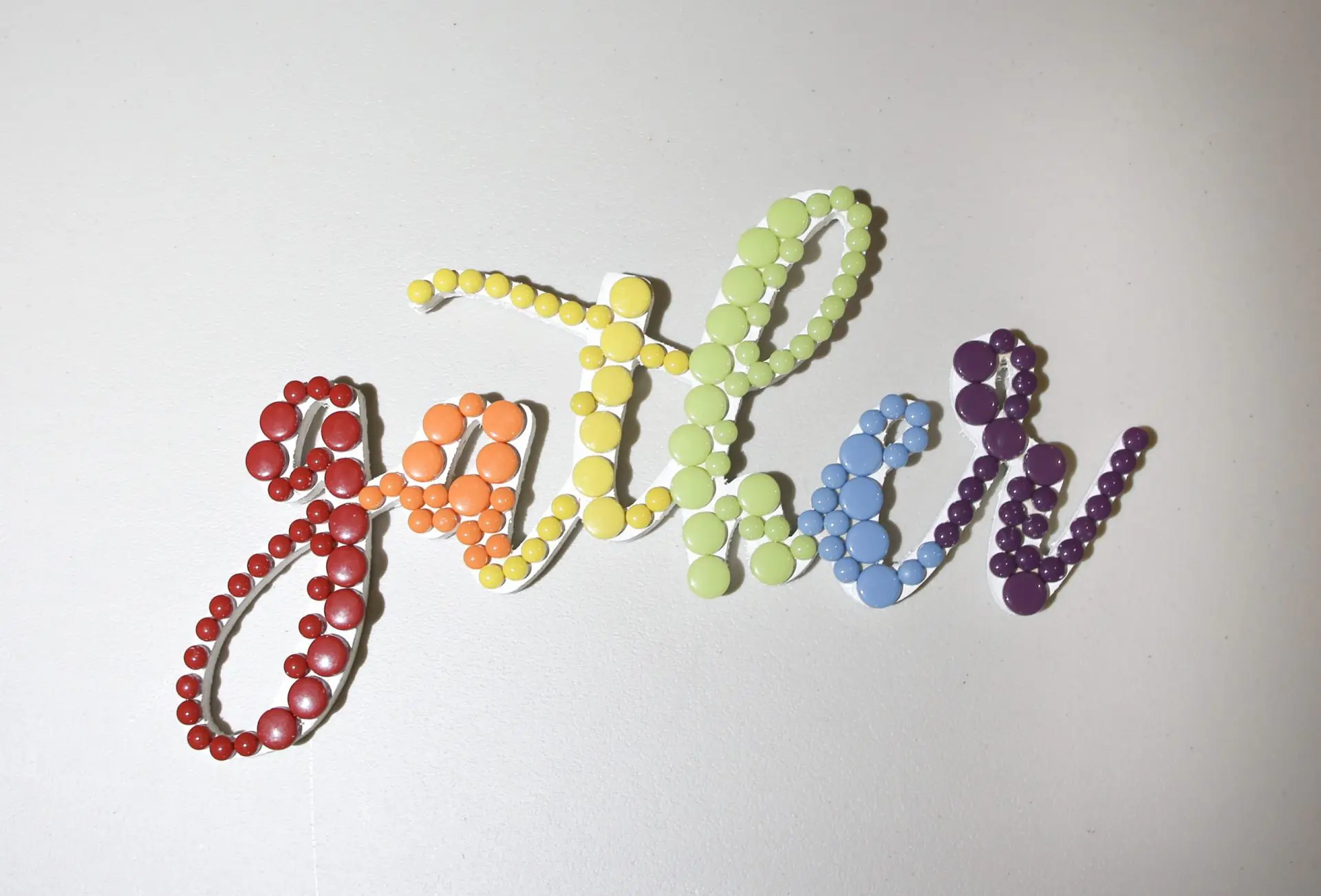 This mosaic spells out “gather” in cursive and moves through the rainbow with every color.