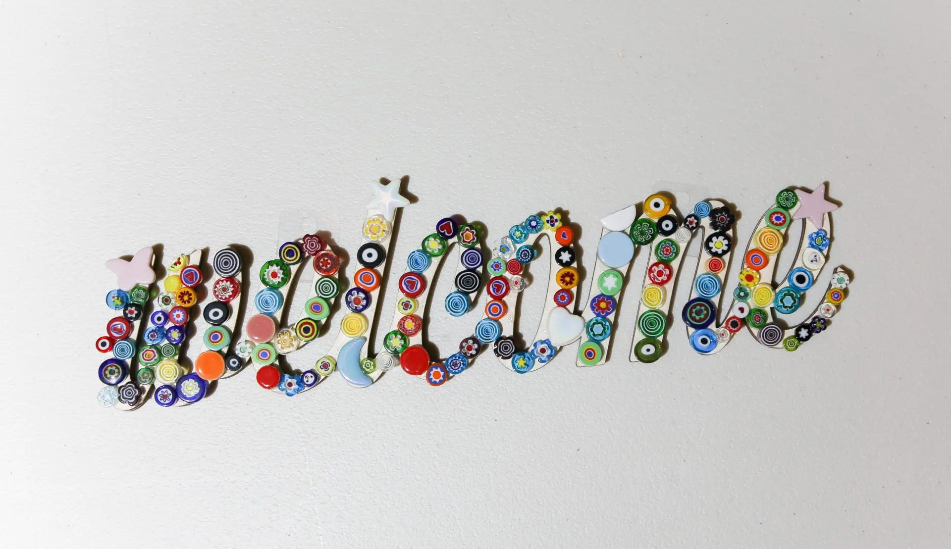 This mosaic spells out “welcome” and includes vibrant tiles with a variety of colors and patterns.