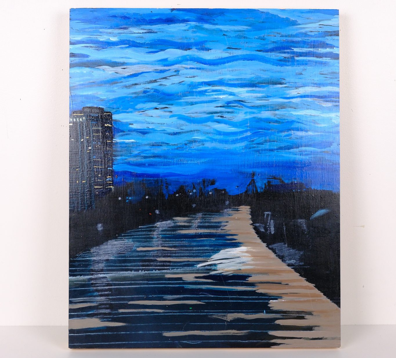 Acrylic painting of gloomy city pier