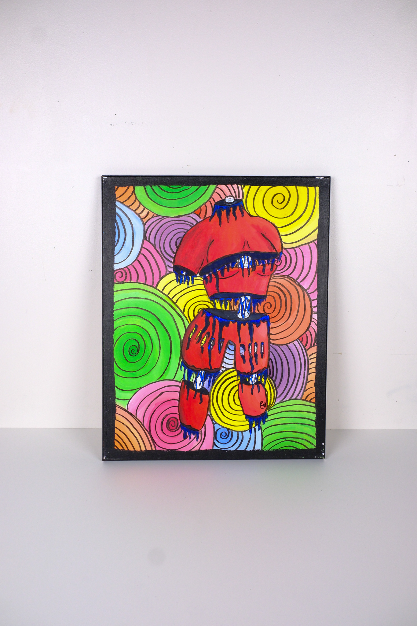 Super colorful acrylic painting. A red body cut into mutiple pieces- ouch!