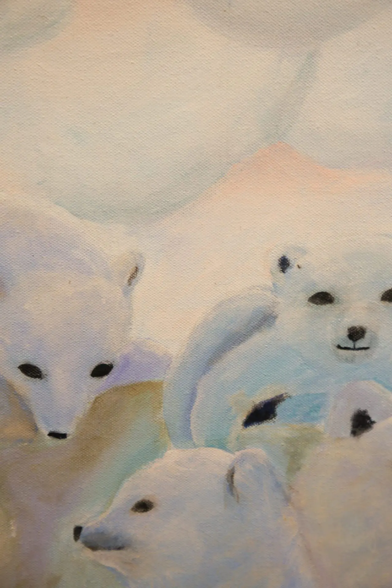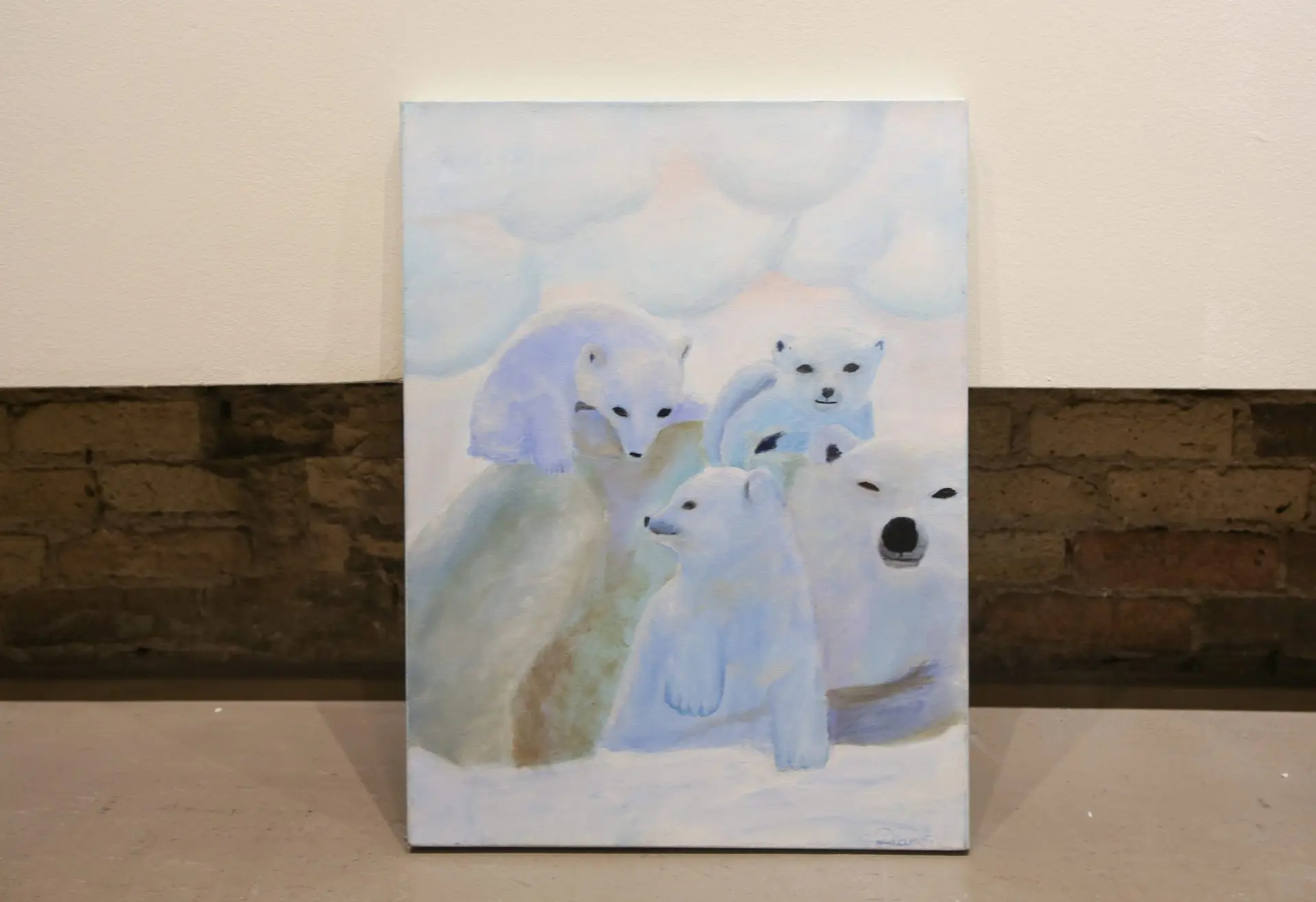 This painting features a mother polar bear and her three cubs with a dreamy snowy background.