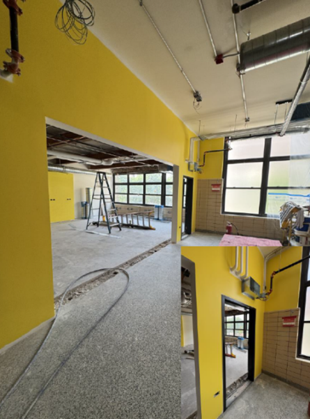 July 2025, wall framing and drywall complete, elevator shaft complete and elevator installation in progress, new roof installed, HVAC systems and mechanical overhead equipment installed.