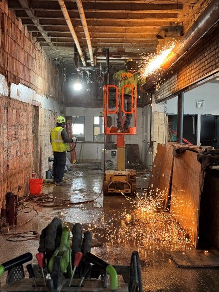 May 2025, full demolition complete, underground plumbing installed, excavation at elevator shaft complete, roof demolition and temporary roof installed, mechanical and electrical in progress.